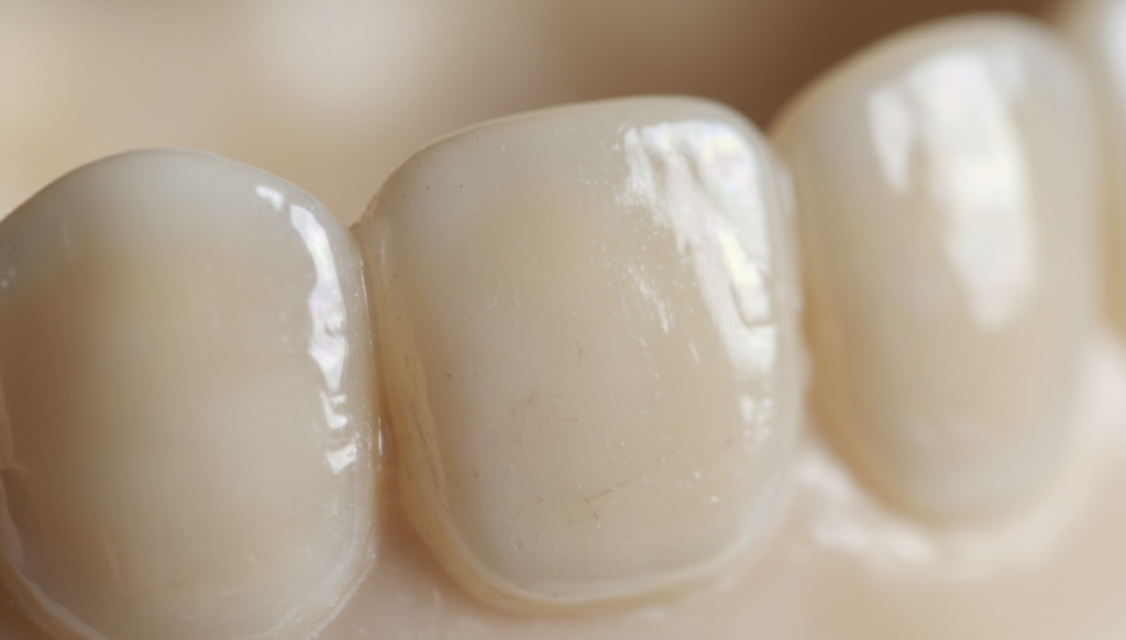 特に光が当たると反射するため、奥歯であっても視認されやすい傾向があります。セラミックは天然の歯と同じトーンの白色に調整でき、歯の根元から先端にかけて自然なグラデーションを再現することも可能です。隣接する歯との色調を合わせることで、口を大きく開けても目立ちにくい仕上がりになります。