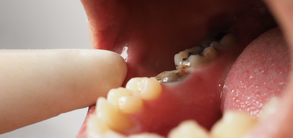 特に歯ぐきが下がって歯の根元が露出している場合、根面う蝕と呼ばれる虫歯が発生しやすくなります。根面はエナメル質で覆われていないため、虫歯の進行が早いのが特徴です。