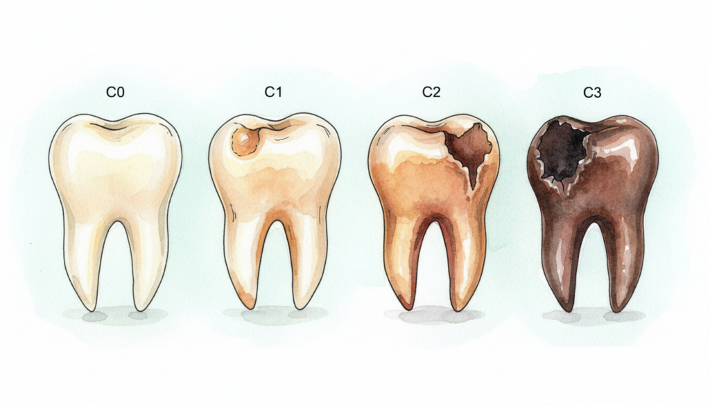 虫歯の進行度は、C0(要観察歯)からC4(残根状態)まで5段階に分類されます。