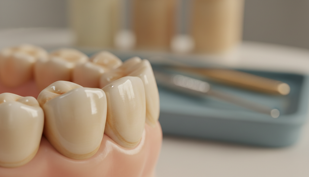 メタルボンドセラミッククラウンは、内側を金属で裏打ちしたセラミックのクラウンで、強度が高く割れにくい特徴があります。